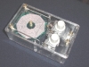 After cutting the chassis base and panel, the first thing to do is prepare the capacitor for mounting. The circuit board that is on the front needs to be removed. Also take off the two mounting brackets from the bottom and turn them around. I used some metal standoffs with 6-32 threads and a nut to attach them. If you have metric hardware, you can attach the standoffs with a screw threaded in. The standoffs are ½ inch (12 mm) long. The capacitor and vernier has to be aligned to work. The capacitor shaft is 6 mm, so I used a piece of tape around the shaft to help keep it centered.