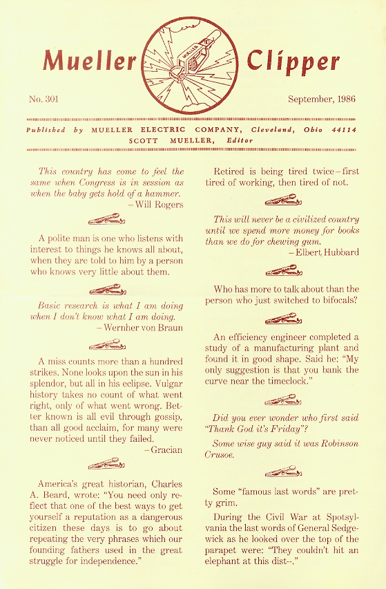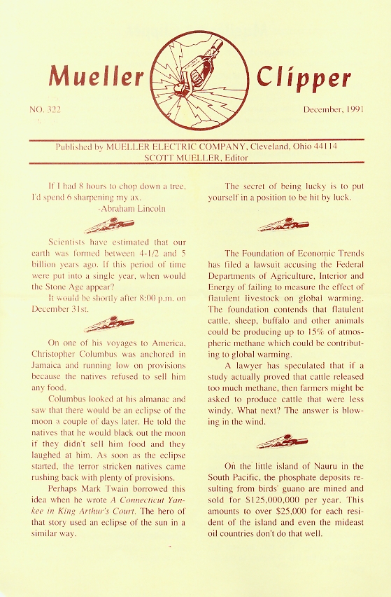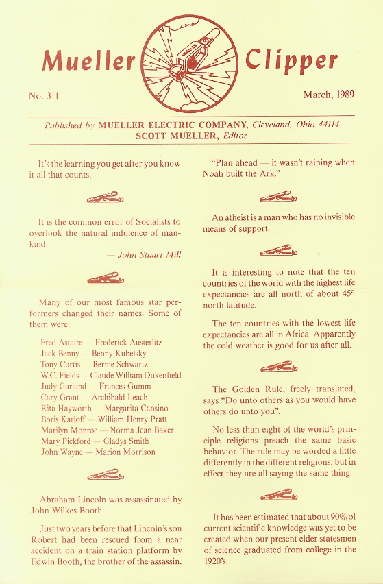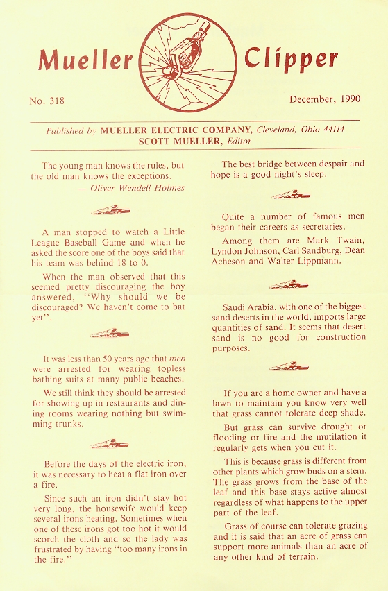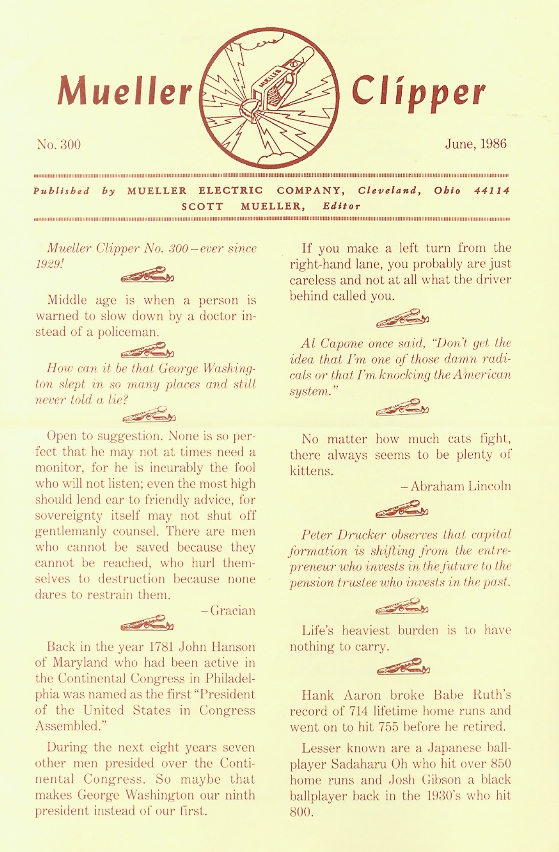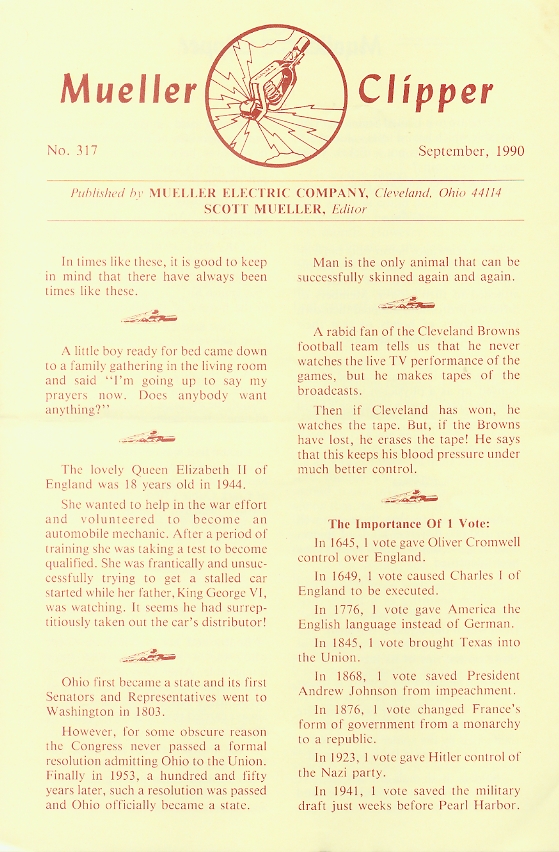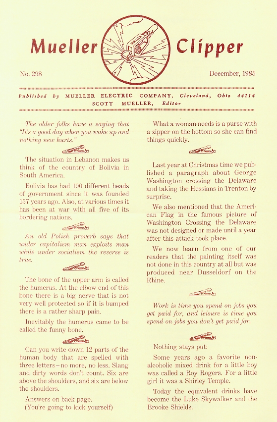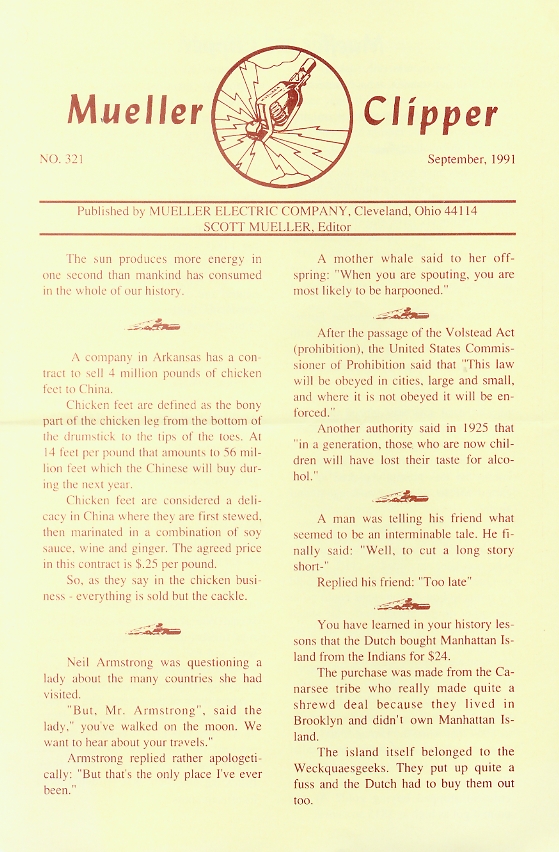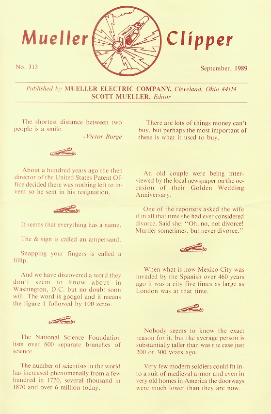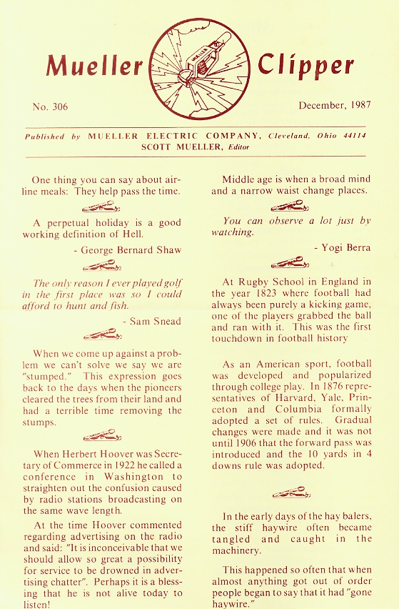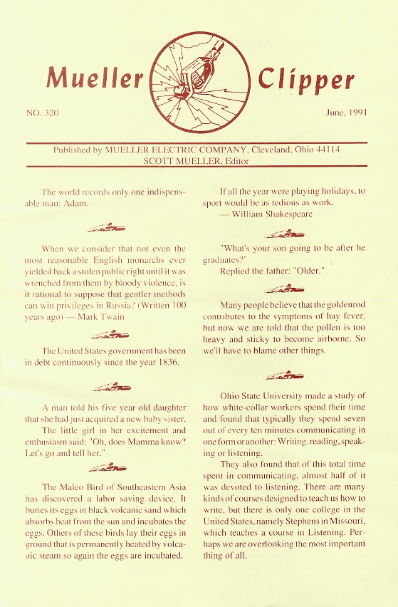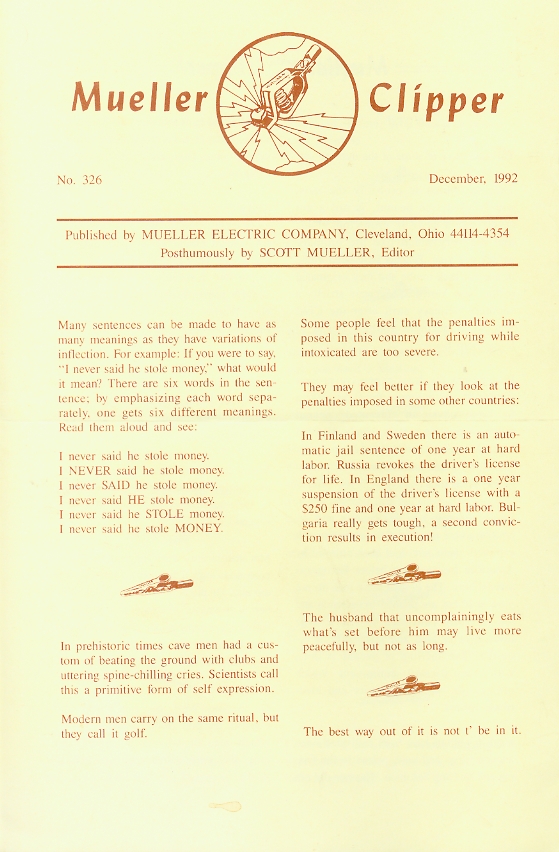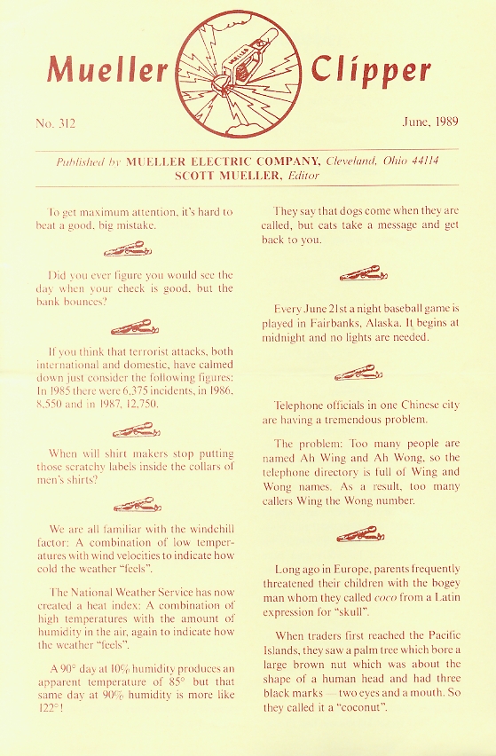 Have you ever done a Google search and come up empty? This is what happened when I attempted to look up more information on The Mueller Clipper. The Mueller Clipper was a newsletter that was published by the Mueller Electric Co., maker of fine quality alligator clips. As a distributor of their products, we would receive these quarterly newsletters. It was always a welcomed event when the Lou, the postman brought the MC.