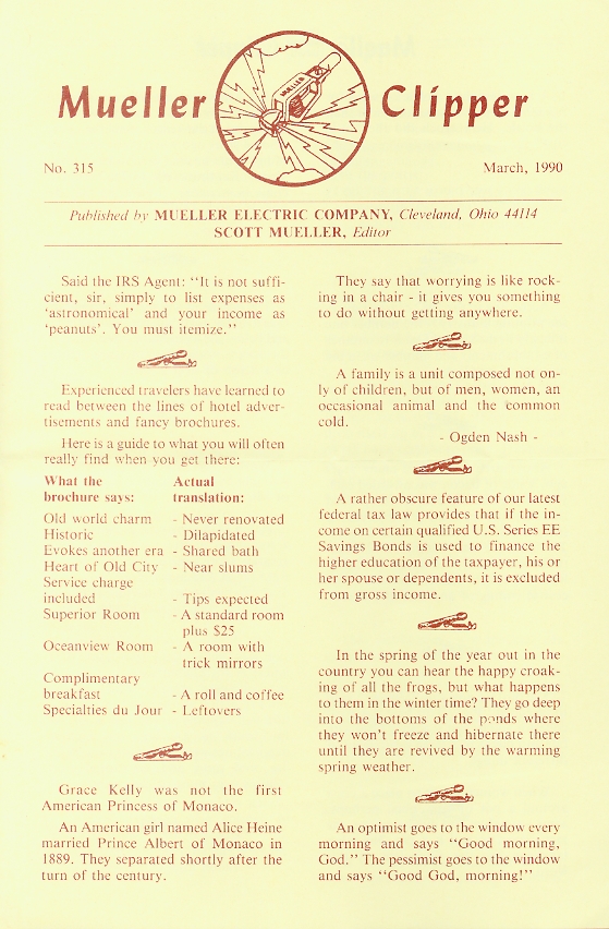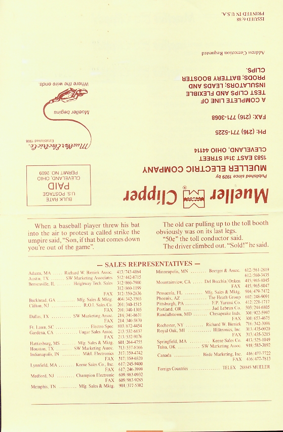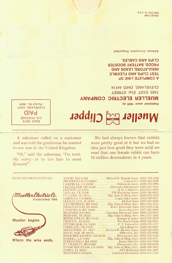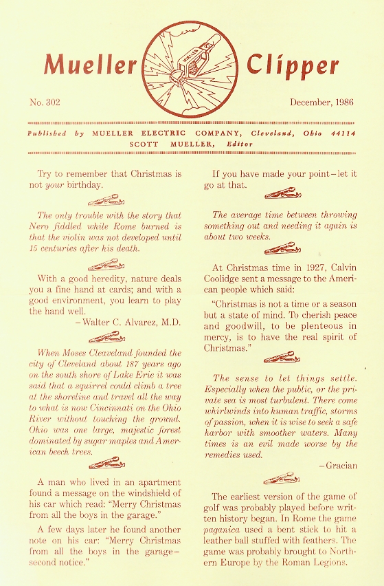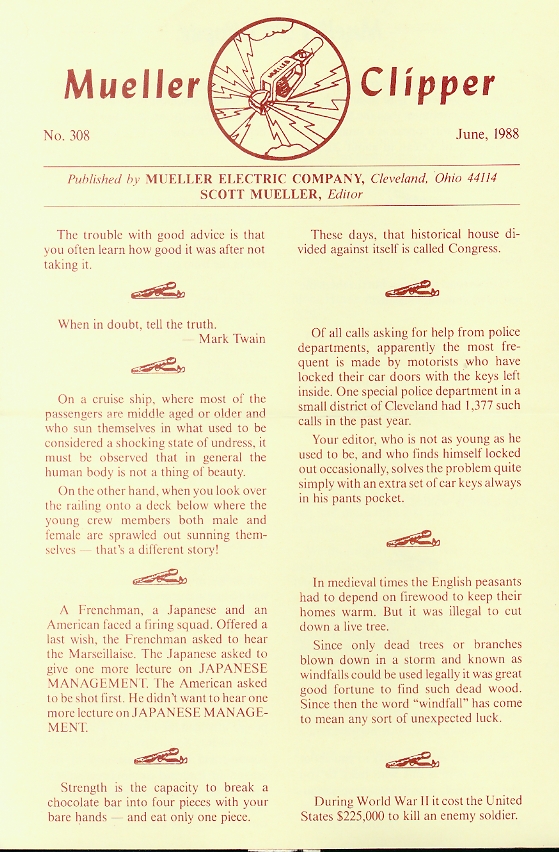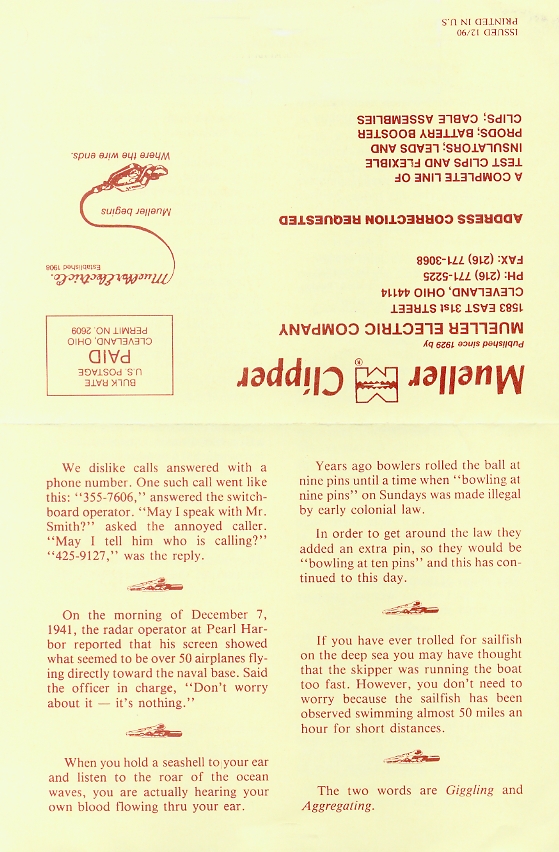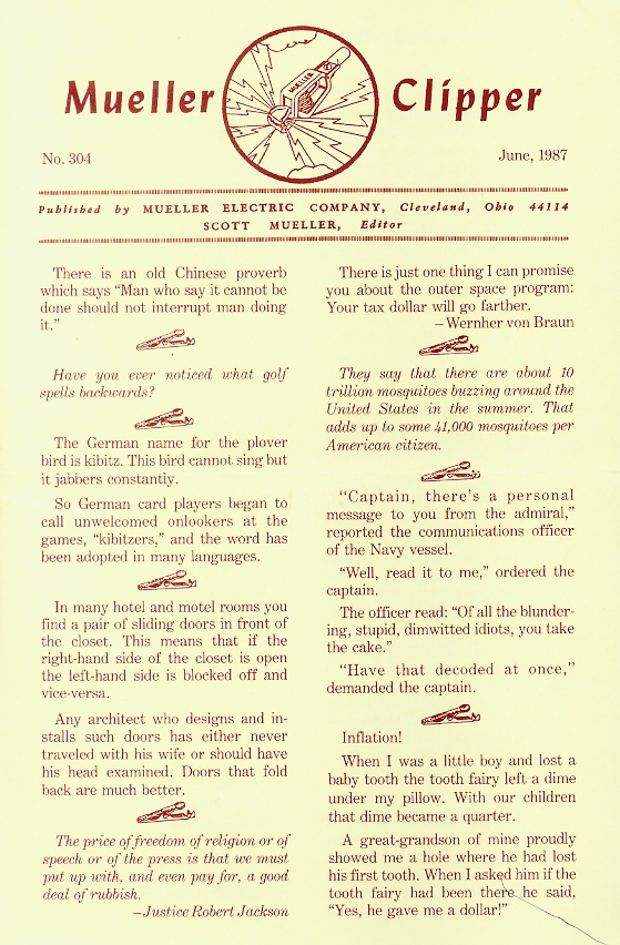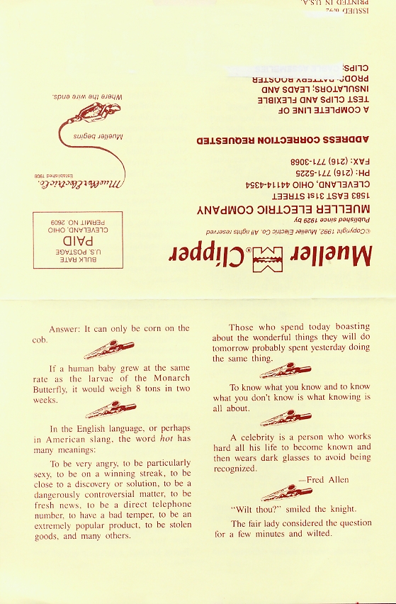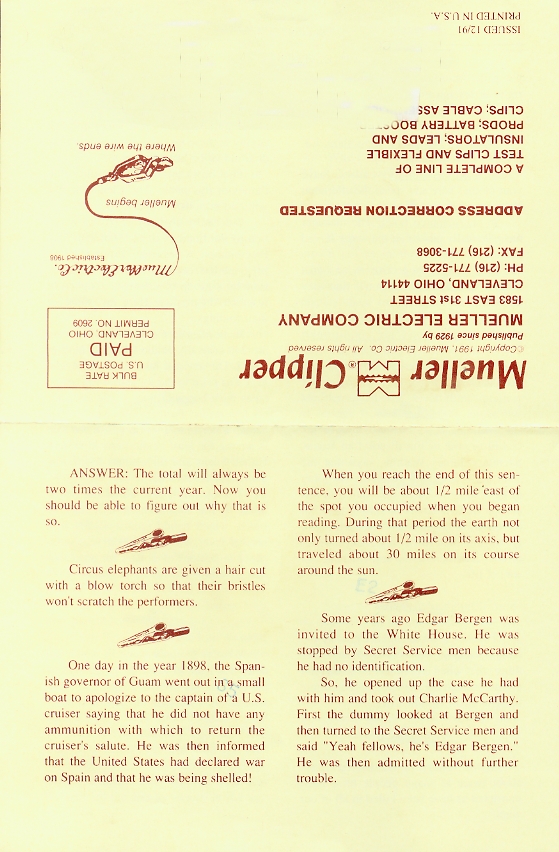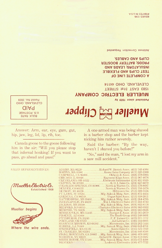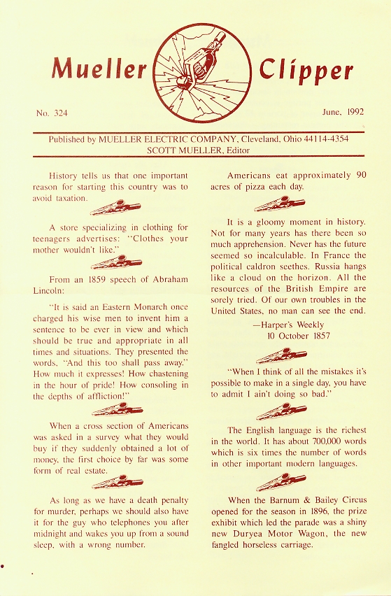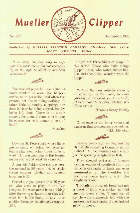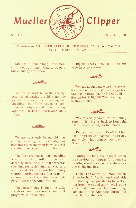 Have you ever done a Google search and come up empty? This is what happened when I attempted to look up more information on The Mueller Clipper. The Mueller Clipper was a newsletter that was published by the Mueller Electric Co., maker of fine quality alligator clips. As a distributor of their products, we would receive these quarterly newsletters. It was always a welcomed event when the Lou, the postman brought the MC.