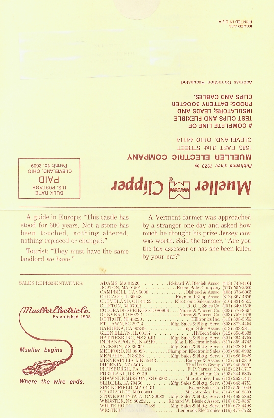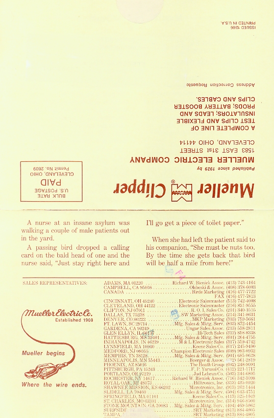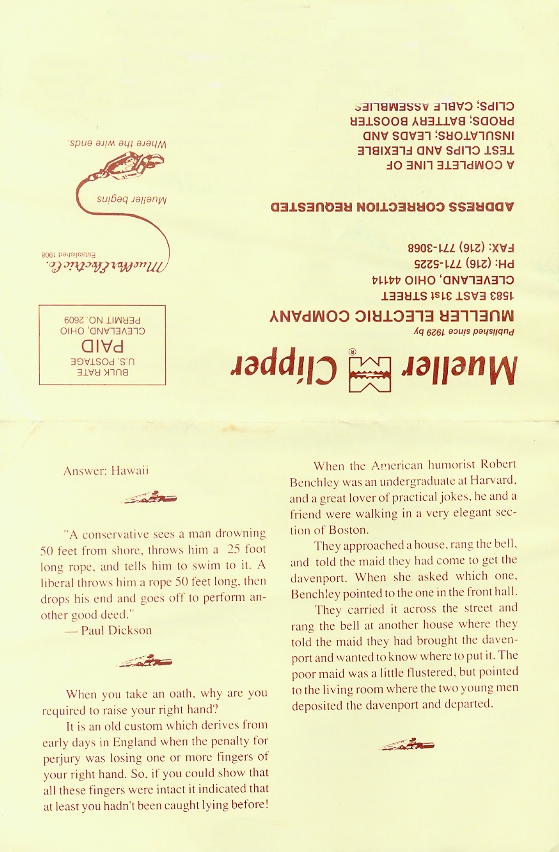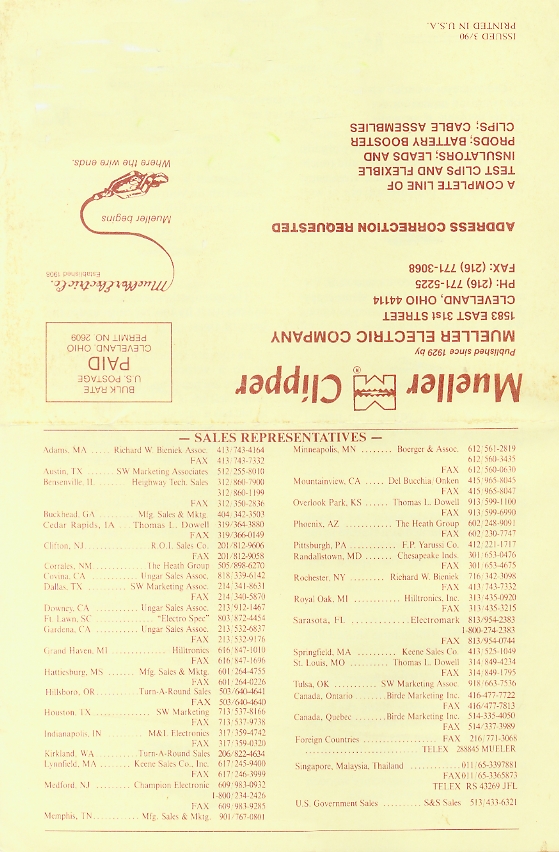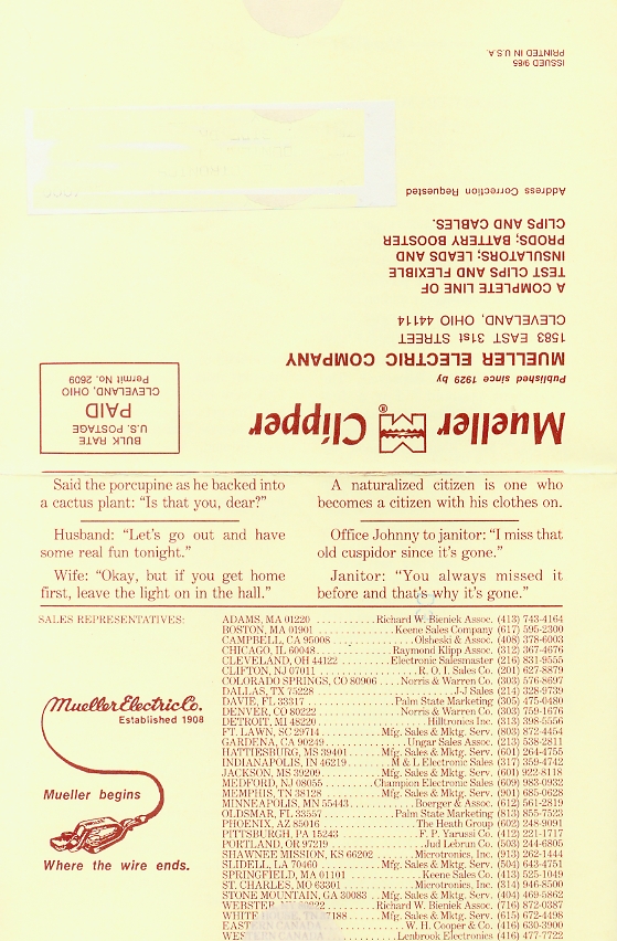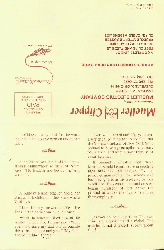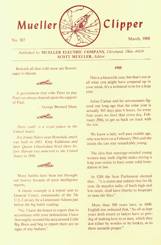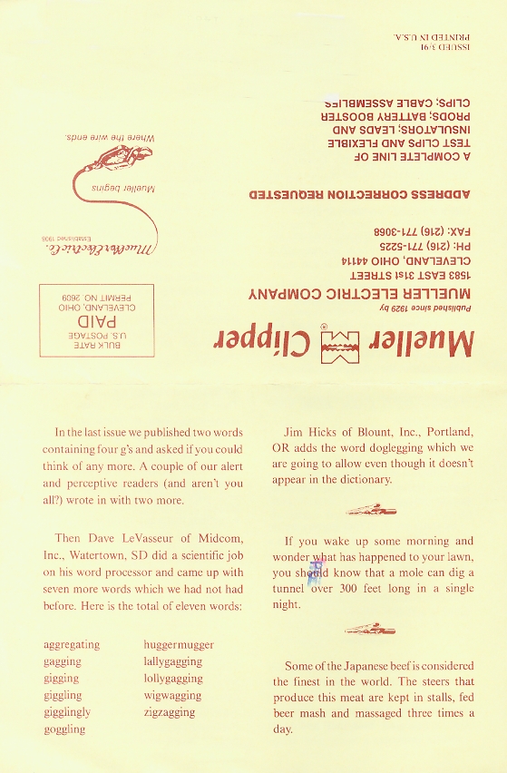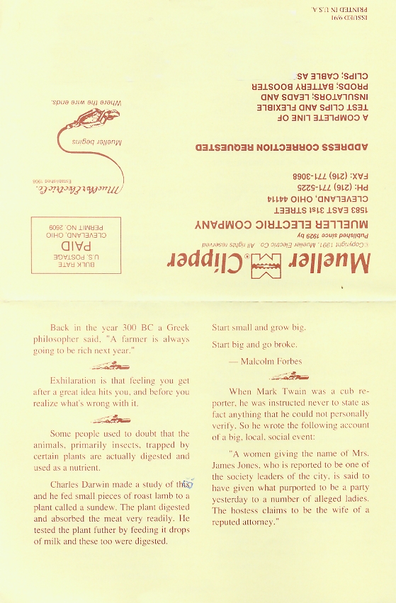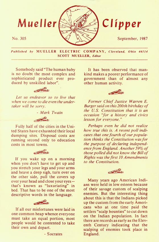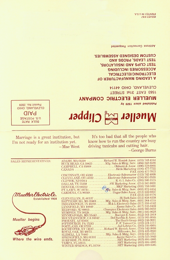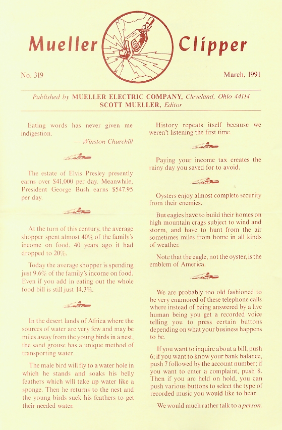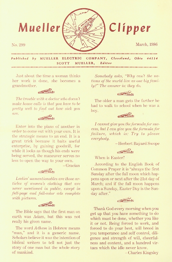 Have you ever done a Google search and come up empty? This is what happened when I attempted to look up more information on The Mueller Clipper. The Mueller Clipper was a newsletter that was published by the Mueller Electric Co., maker of fine quality alligator clips. As a distributor of their products, we would receive these quarterly newsletters. It was always a welcomed event when the Lou, the postman brought the MC.