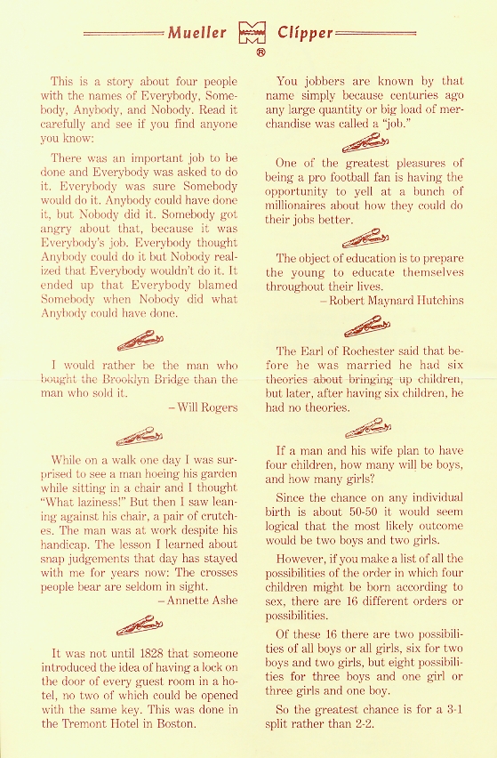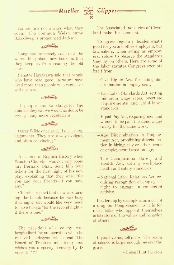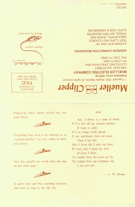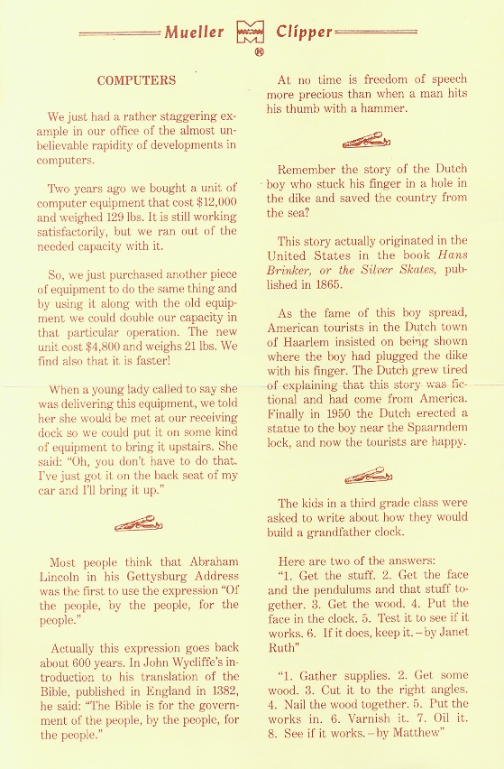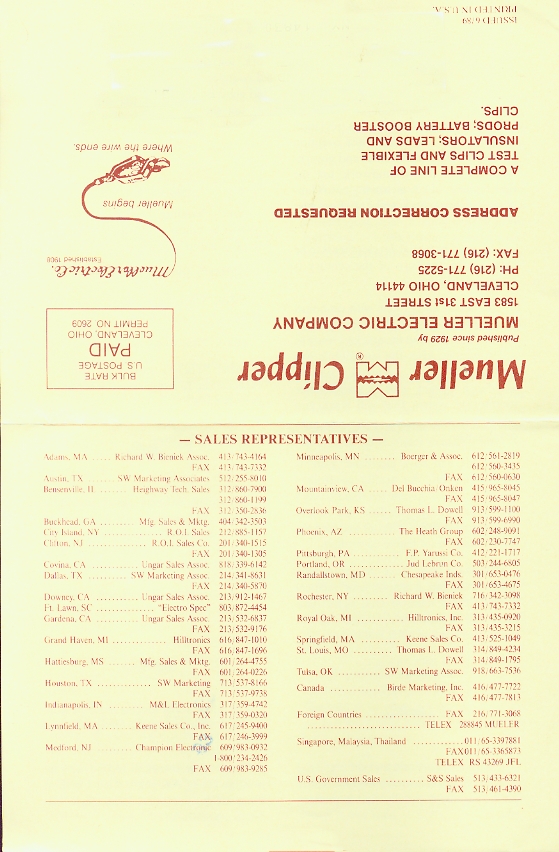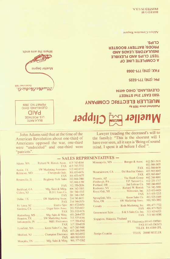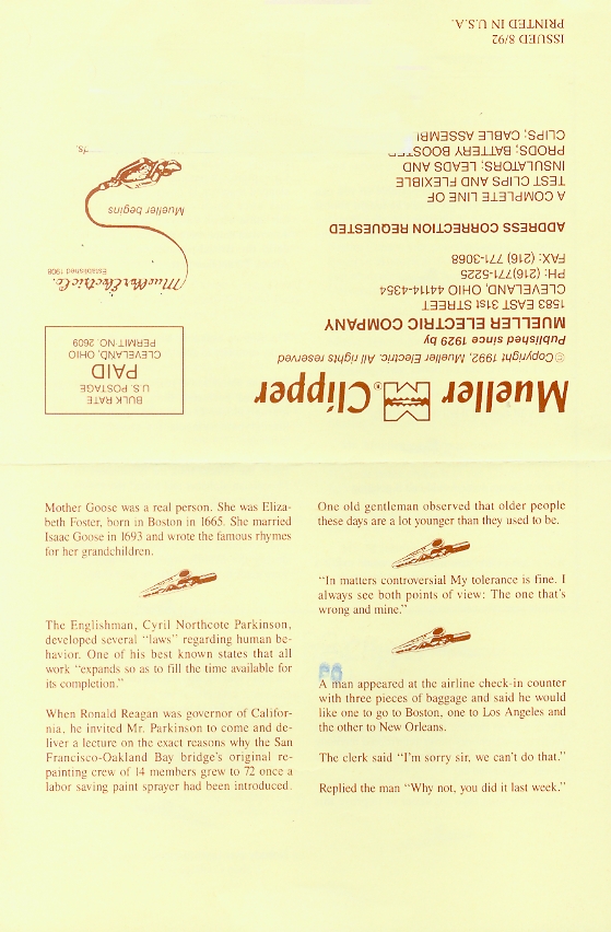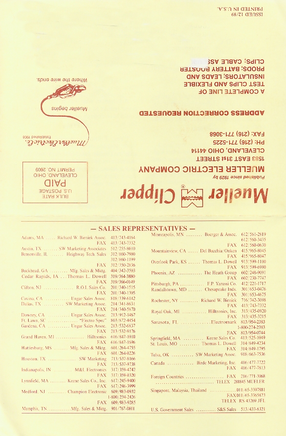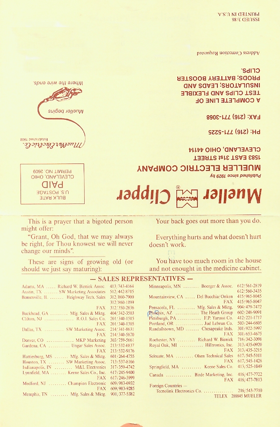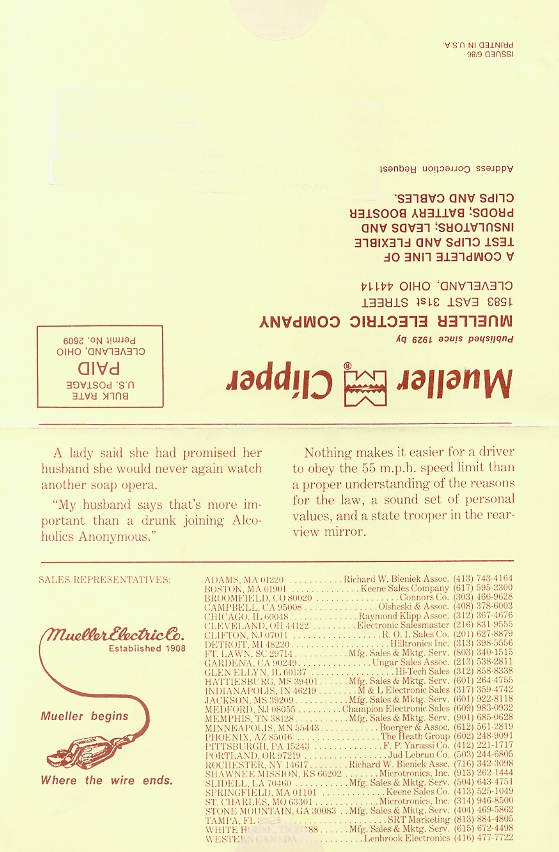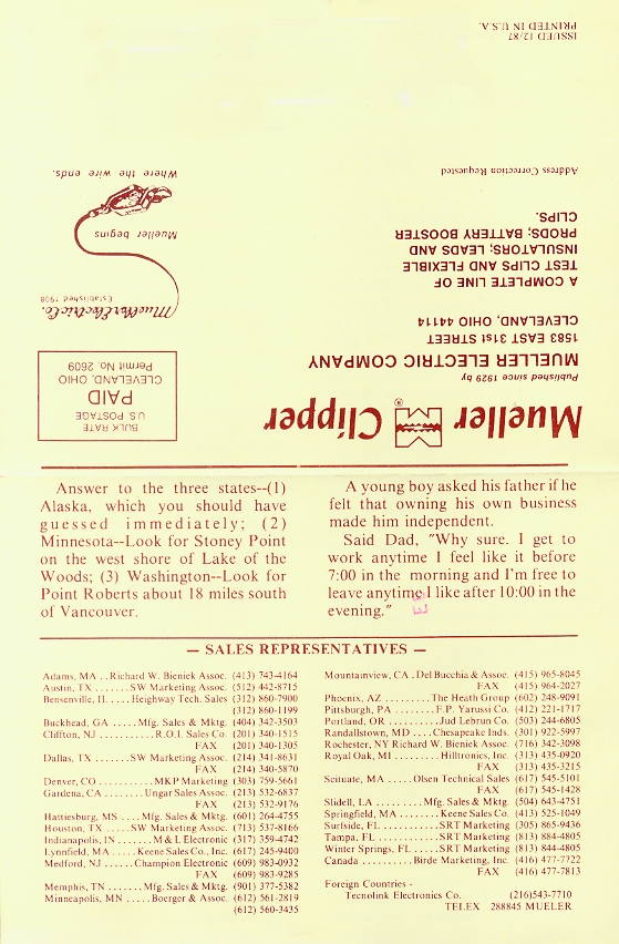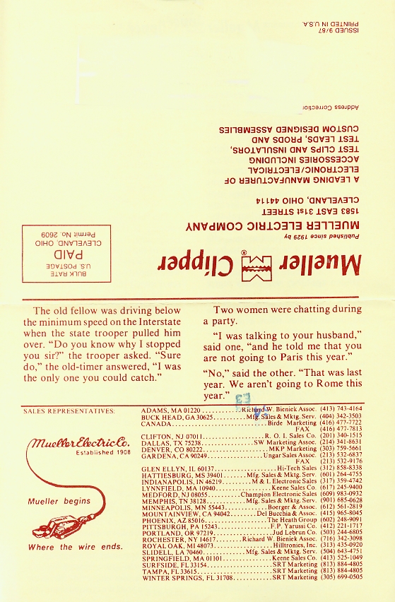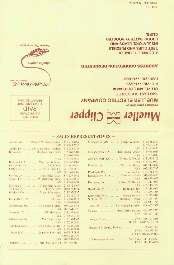 Have you ever done a Google search and come up empty? This is what happened when I attempted to look up more information on The Mueller Clipper. The Mueller Clipper was a newsletter that was published by the Mueller Electric Co., maker of fine quality alligator clips. As a distributor of their products, we would receive these quarterly newsletters. It was always a welcomed event when the Lou, the postman brought the MC.