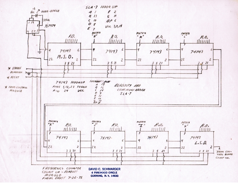 Hi Friends. While going through my papers, I found the plans for a frequency counter project that I built in 1975. I always tried to keep decent records of my major projects and this was a major project. I was 25 years old then, and had good eyesight to hand wire all these chips.
