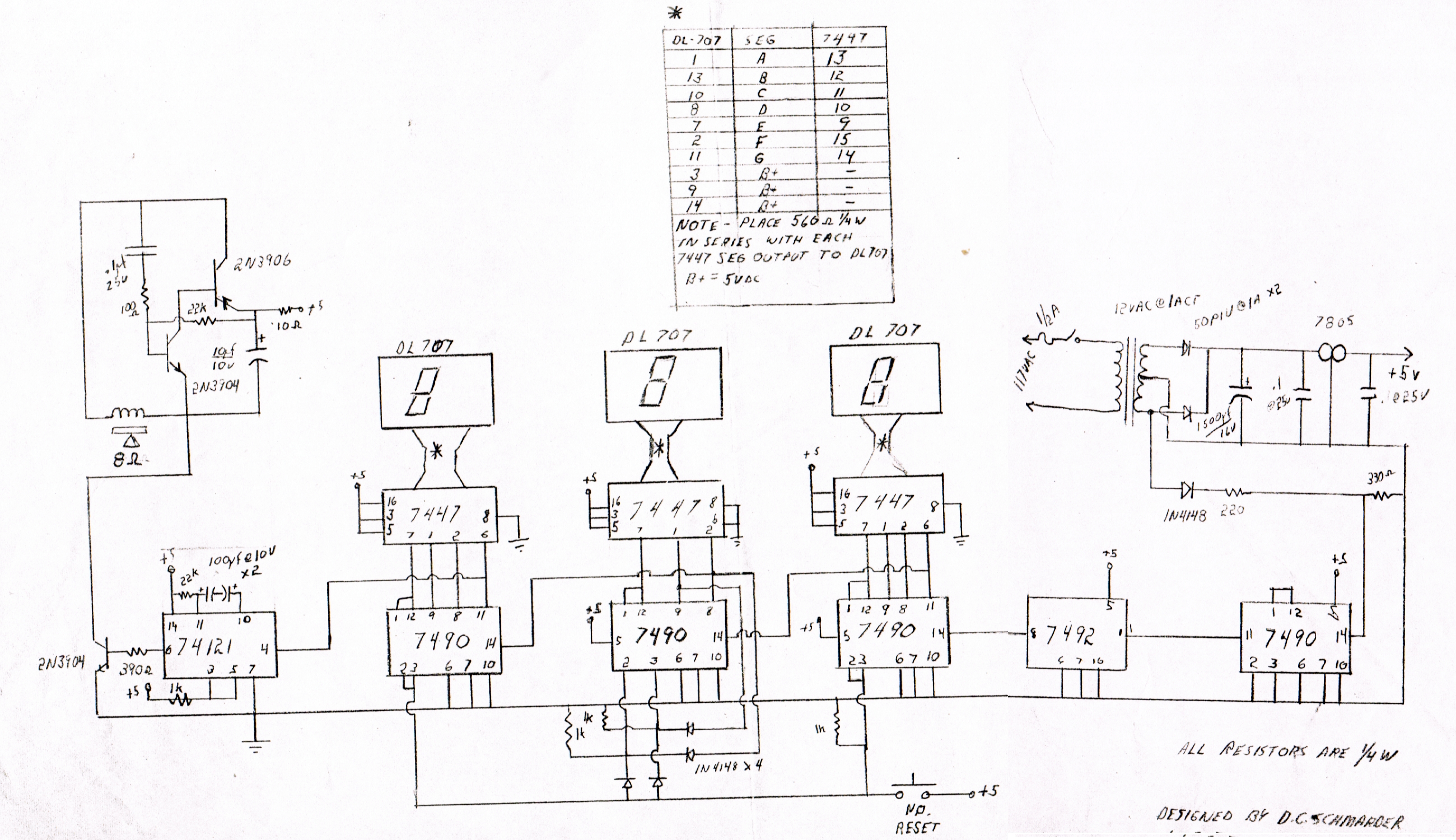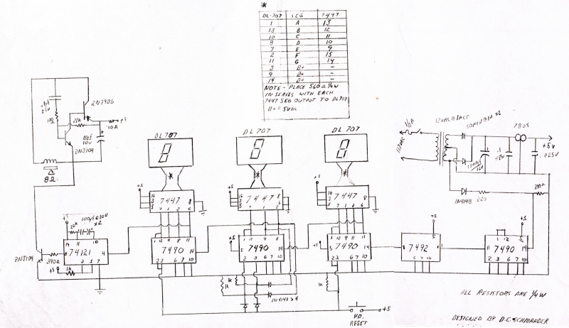 This circuit uses all TTL type digital chips, which were popular 35 years ago. The timing was done by detecting the 60 Hz. line frequency and dividing it by 60 for a one second time base. (Look right to left on the schematic.) This signal was fed to the digital dividers to count up to 9 minutes and 59 seconds. When the next pulse came through the display read 0:00 and a noise was emitted. There is a manual reset button to set the display back to zero to begin another ten minute count up.