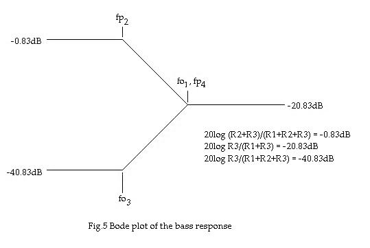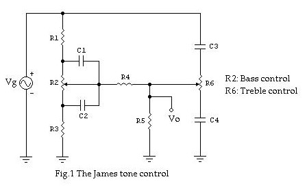 Here, R4 offers some isolation between this stage and the treble control section (frequencies above the center frequency are affected by this control). R5 represents the input resistance of the amplifier connected to the output of the James network and should be selected such that it imposes no appreciable load on the network. Here we assume that C3 and C4 are open circuits at the bass frequencies.