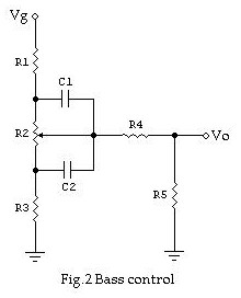 Let´s begin studying the bass control section (fig.2), which has influence over the frequencies below the designed center frequency of the overall James network.