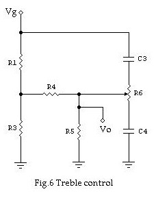 Next, we will analyze the treble control. We have already stated that the treble frequencies are those above the center frequency for which the James network is designed. We may consider C1 and C2 as short circuits at these frequencies. Therefore, R1 and R3 along with R4 are part of the treble network (fig.6).