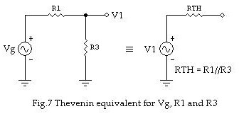 In order to facilitate calculations, we shall first find the Thevenin equivalent for Vg, R1 and R3. In fig.7, the equivalent Thevenin voltage source, V1, is given by: