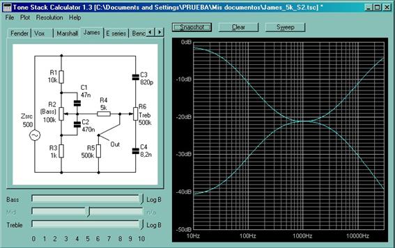 Tone Stack Calculator 1.3 is an excellent software program that can be used for simulation of tone-control networks. It may be downloaded from: http://www.duncanamps.com/tsc/