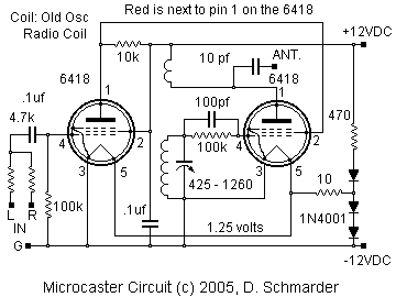 The audio from a headphone level signal comes in to the control grid of the first 6418. The signal is amplified on the plate, dropped through the 10k resistor. The plate of the first tube is connected to the grid of the second tube, the rf oscillator.