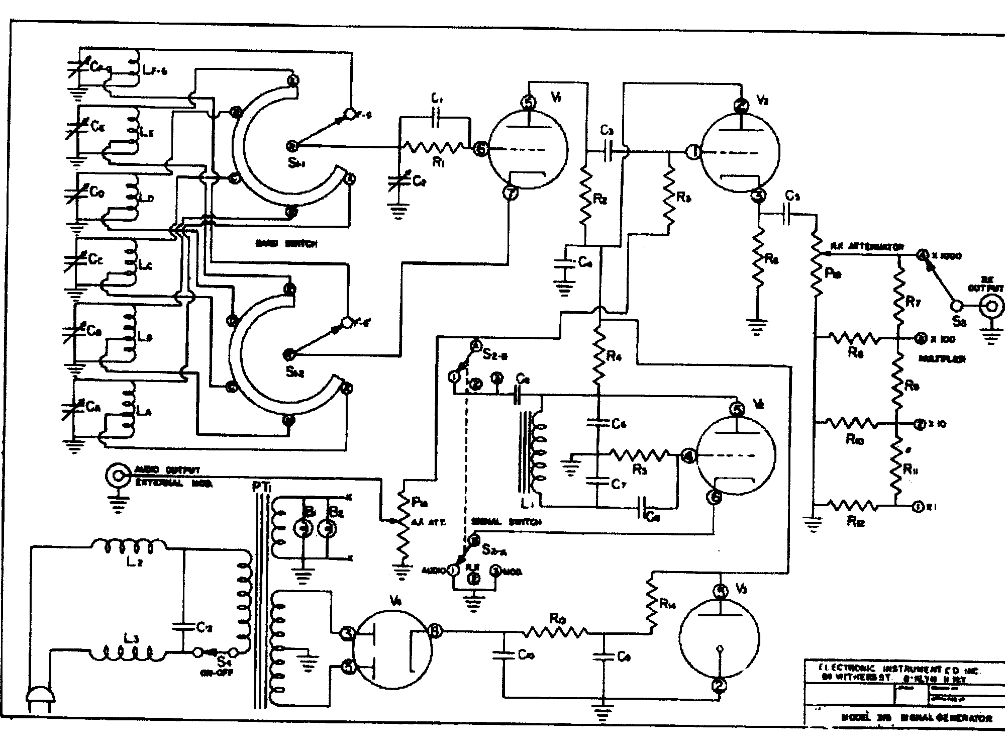 Check the schematics below and see how they compare with what you have. Please don't ask me for specific design information on other signal generators. I may do more of these but only if the generator generates above average interest. I do have an Eico 324 that I might convert. It has enough tube sections but the power supply isn't that great.