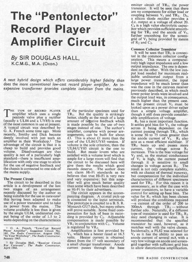 The audio stage started out as a clone of Sir Douglas Hall’s Pentonlector record player amplifier but had to be significantly modified for reliable operation at 12v HT.