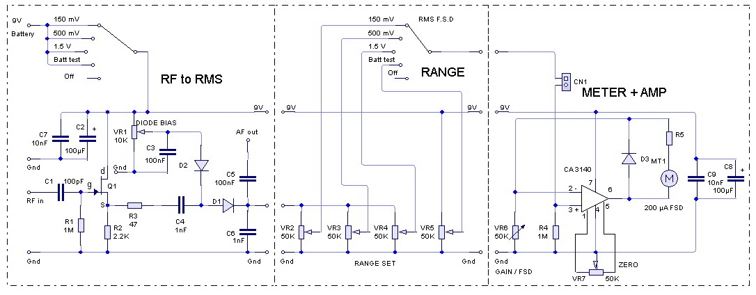 I was impressed by Rodney Bynes approach to the measuring part of the circuit and have virtually “cloned” it for my front end, the “Range select” part of the circuit is my main contribution, the meter amplifier is based on a design by Jim Tregellas.