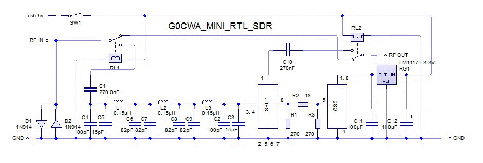 The only problem I had was when switching between the receive bands sometimes the dongle would lock up, this was due to the current demands of the relays and smoothing caps I managed to “cure this problem” by reducing the values of C11 and C12 anything above 100 nF should be ok.