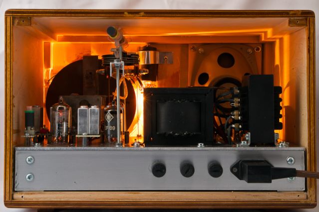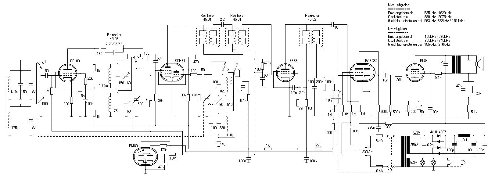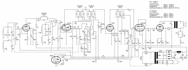 It follows the standard circuit used in many variations during the fifties – using a ECH81 (6AJ8) as mixing stage, a EF89 (6DA6) in the IF stage, a EABC80 (6AK8) as rectifier and AF pre-stage and a EL84 (6BQ5) as AF power stage. I added some modifikations, namely a RF pre-stage employing a tuned bandfilter using an EF183 (6EH7) and a magic eye since a tube radio must have a magic eye.