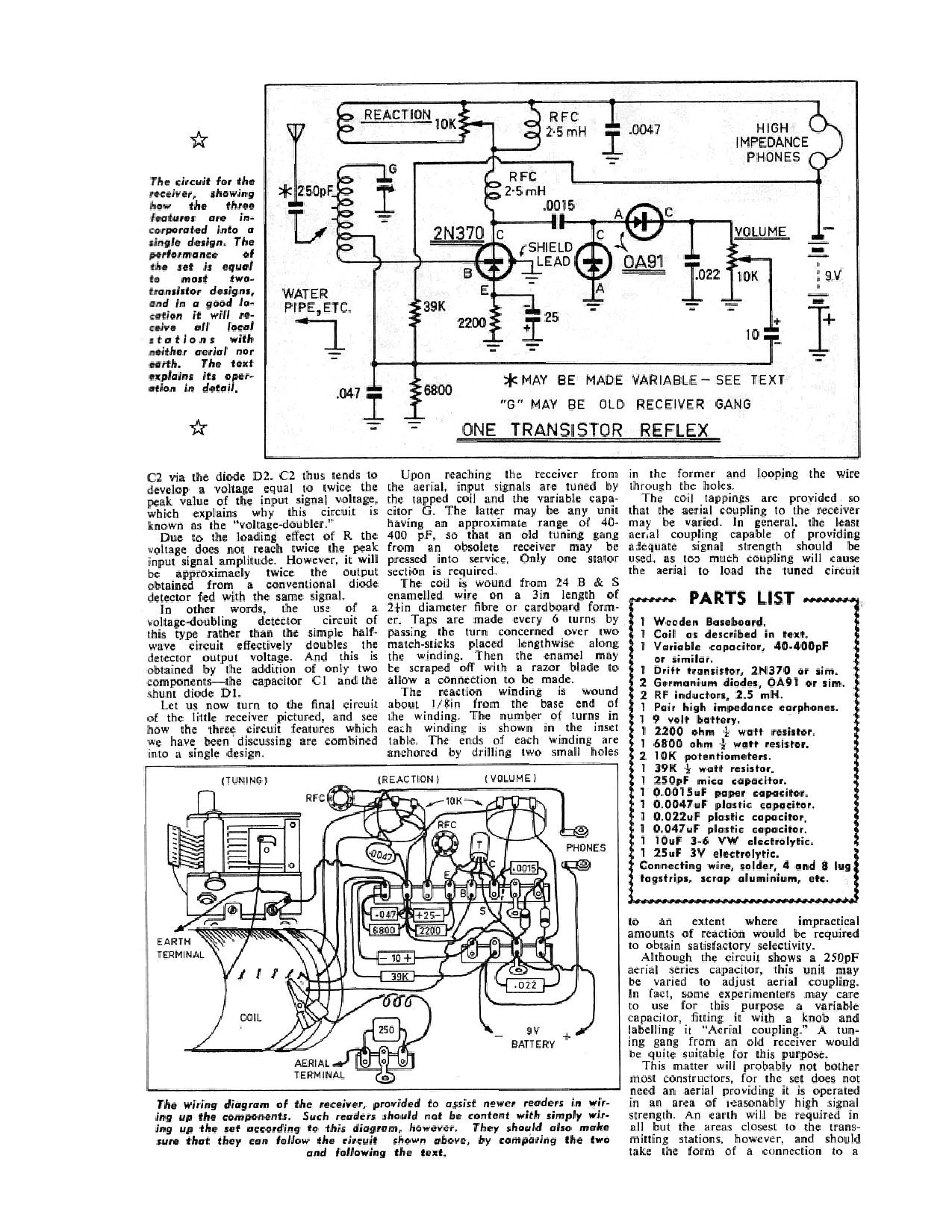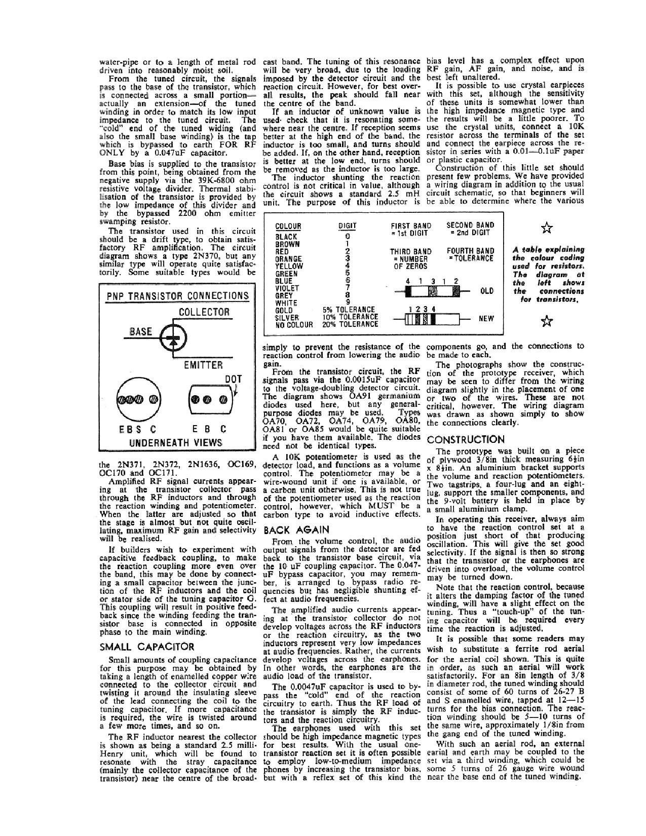 Life and many other projects got in the way but here it is after a space of forty two years. The set is a one transistor reflex design with voltage doubling detection and regeneration. The transistor used is an OC169, but could be an OC170 or OC171. American builders could use a 2N370 or 2N371. The later AF117 would also be suitable.